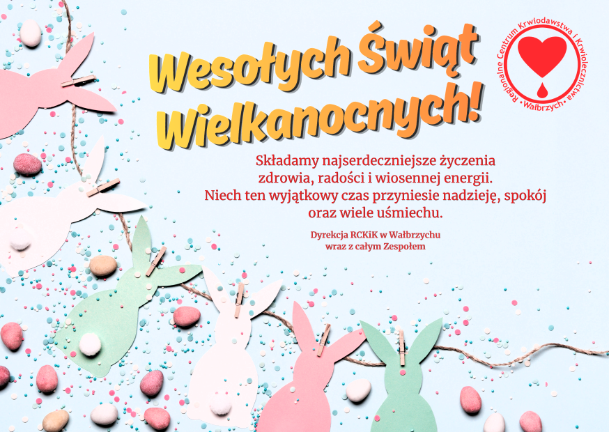 4 kwietnia (Wielka Sobota) zapraszamy do oddania krwi w RCKiK w Wałbrzychu - ul. Bolesława Chrobrego 31, godz. 8:00-12:00.
