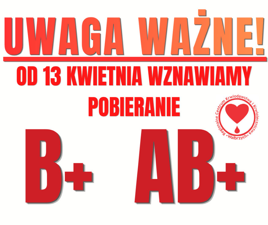 Od 13 kwietnia br. (poniedziałek) wznawiamy pobieranie krwi grup B Rh+ i AB RH+.