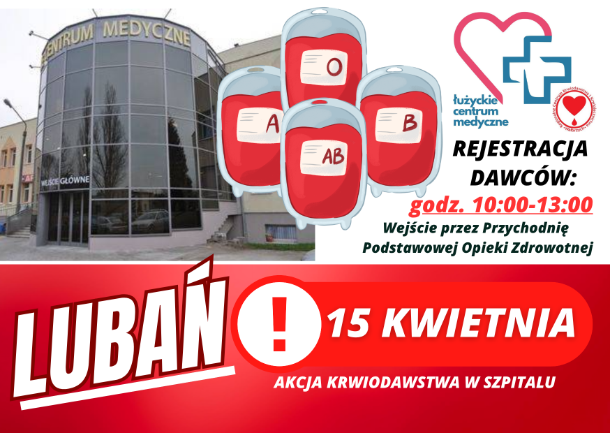 15 kwietnia br. (środa) Akcja stacjonarna w Łużyckim Centrum Medycznym w Lubaniu, ul. Zawidowska 4. Zapraszamy!